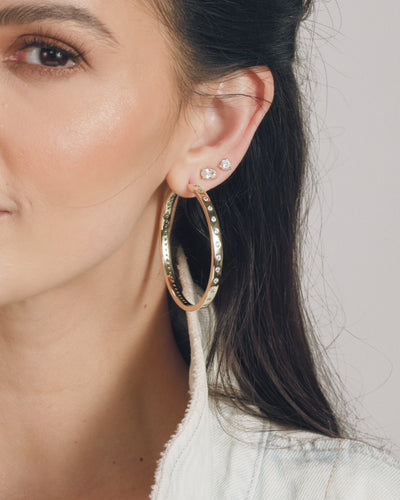 Two sides of Ashley. The 2” Reversible Hoops feature bezel-set round simulated diamonds on one side and a smooth, polished finish on the other, made to hold attention a little longer.