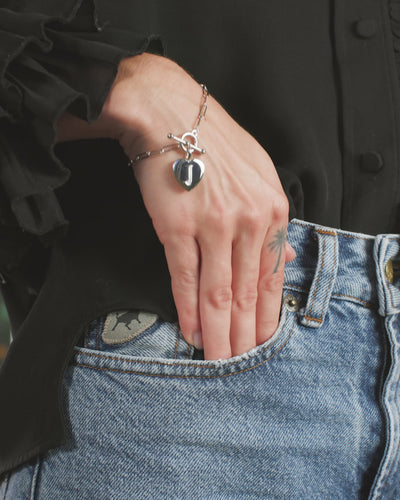 Your story, styled. A sleek paperclip chain meets a toggle closure, finished with a double-sided, heart-shaped charm accented by a pavé-set initial. Personal, polished, and made to stack or shine solo.