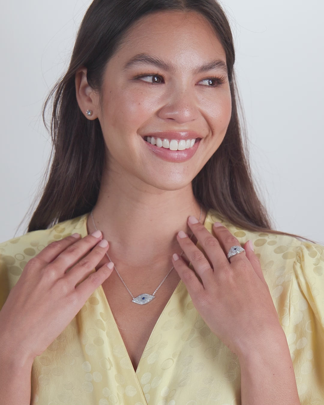 Good Vibes Only! Get your daily dose of protection, strength, and courage with our Blue Evil Eye Necklace. This striking piece features a simulated white pavé diamond eye with a light blue simulated pavé diamond iris and a simulated sapphire pupil, designed to ward off envy. Wear it alone or layer it with other necklaces for a chic, modern way to tell your story.