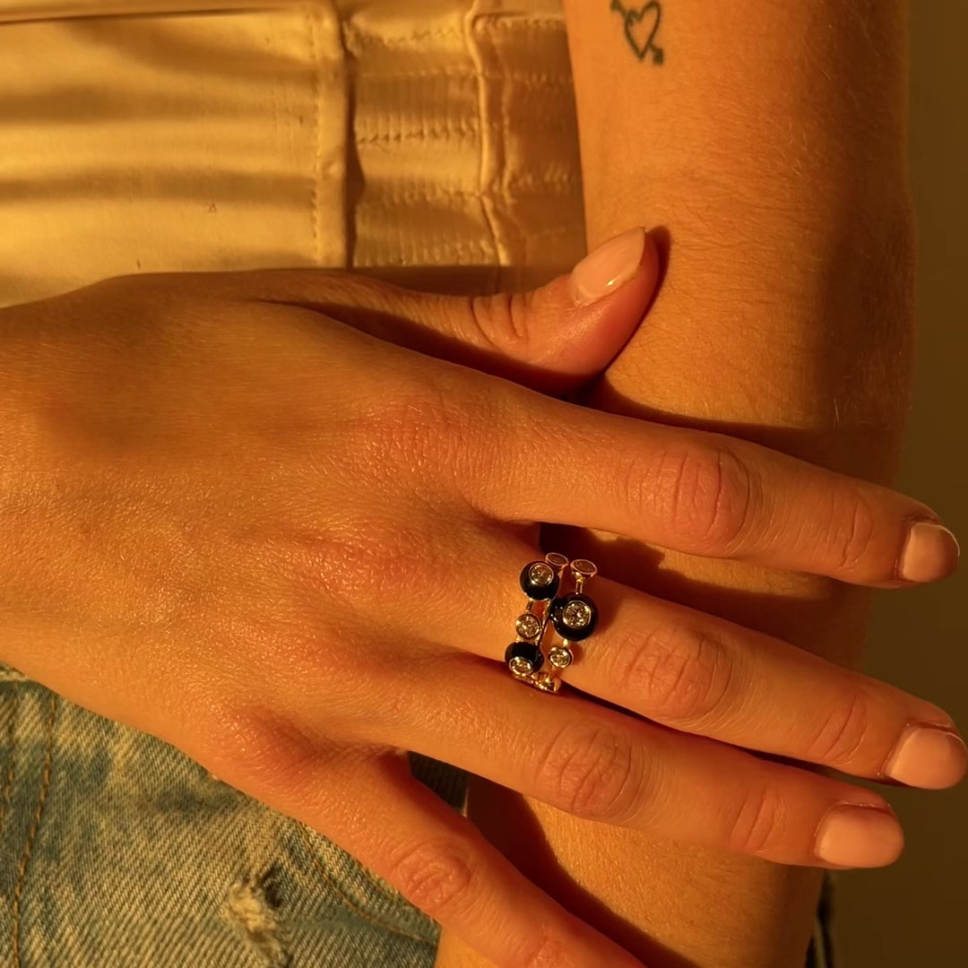 The Cloud 9 Black Ring! All of our enamel is carefully handcrafted with ultra shine lacquer. We love how the black enamel adds a beautiful pop of color that highlights the metal and simulated diamonds for the chicest look. These are so fun to layer with your ring stack.