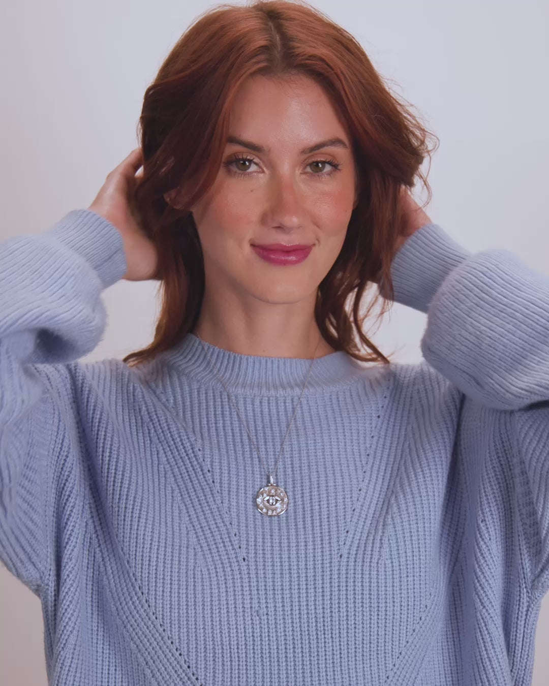 Good Vibes Only! Get your daily dose of protection, strength, and courage with our Evil Eye Medallion Necklace. Set in mother of pearl and framed with pavé simulated diamonds, the Evil Eye Medallion Necklace gives you a chic modern way to ward off envy and tell your story.