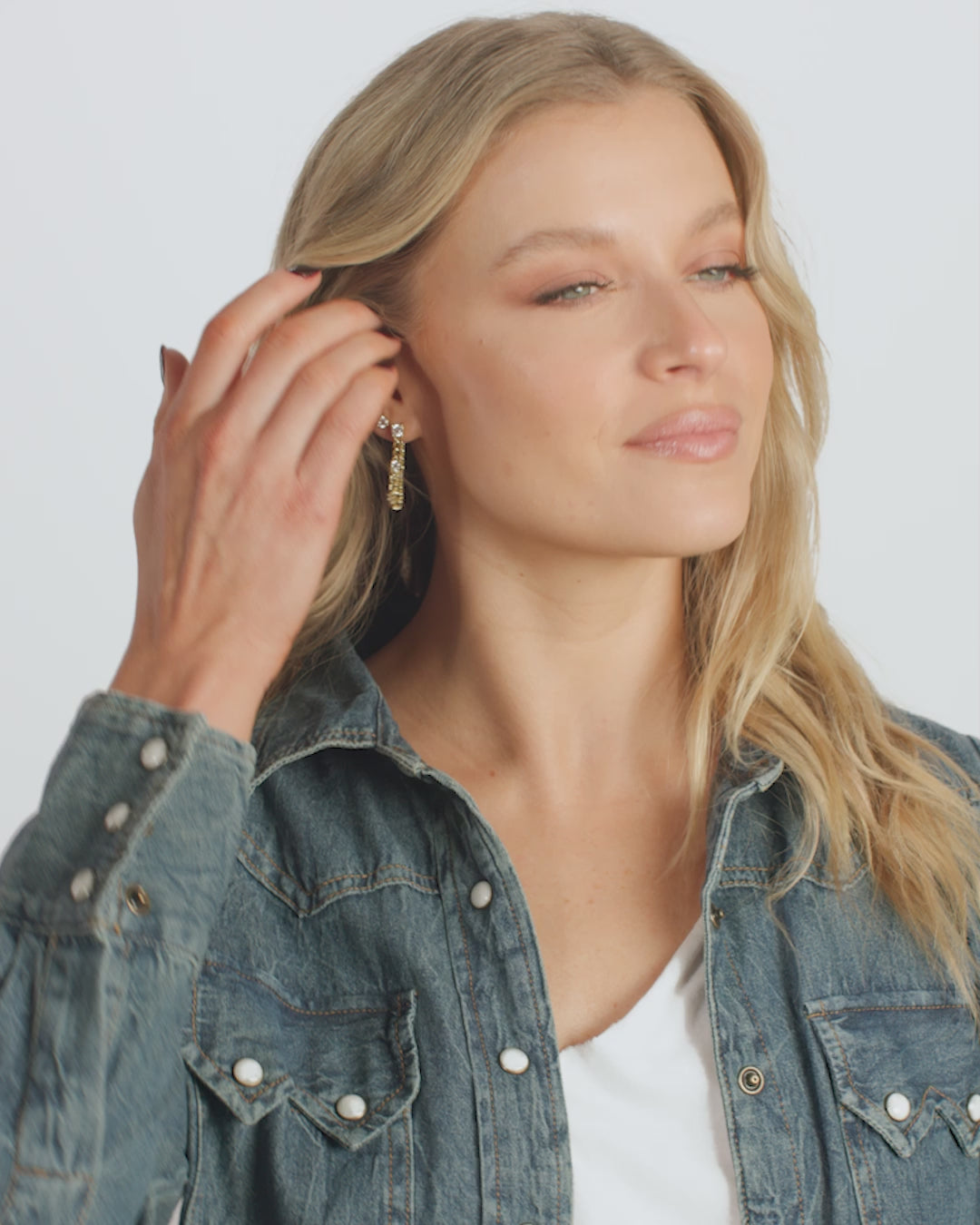 The Julian Triple Diamond Soft Chain Hoops achieve the perfect balance of elegance and edge, transforming a simple stud into a striking contemporary drop earring. Part stud, part chain, all fluid hoop, this unique design features a shimmering trio of simulated diamonds on a delicate 30mm soft chain link. Crafted in luminous 18k gold plating, the 5mm wide chain offers beautiful movement and adds a touch of everyday luxury to our look. This style is an effortless expression of chic versatility.