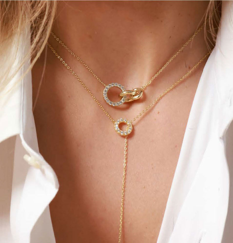 Close-up of a woman wearing multiple necklaces and rings with a blurred background